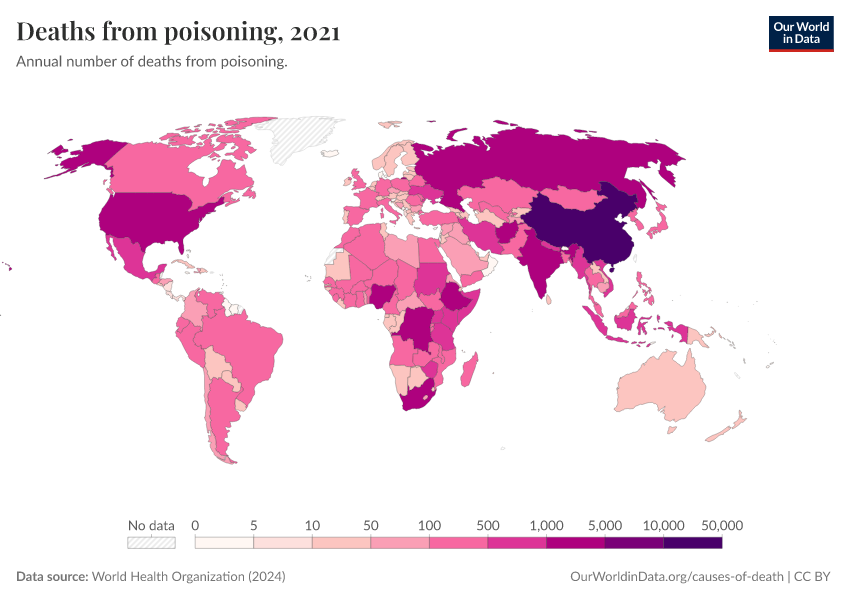 World Health Organization (2024) – with major processing by Our World in Data. “Deaths from poisoning” [dataset]. World Health Organization, “Global Health Estimates” [original data]. Retrieved February 25, 2026 from https://data-unoosa-launches.owid.pages.dev:8789/20250909-093708/grapher/deaths-from-poisonings-ghe.html (archived on September 9, 2025).