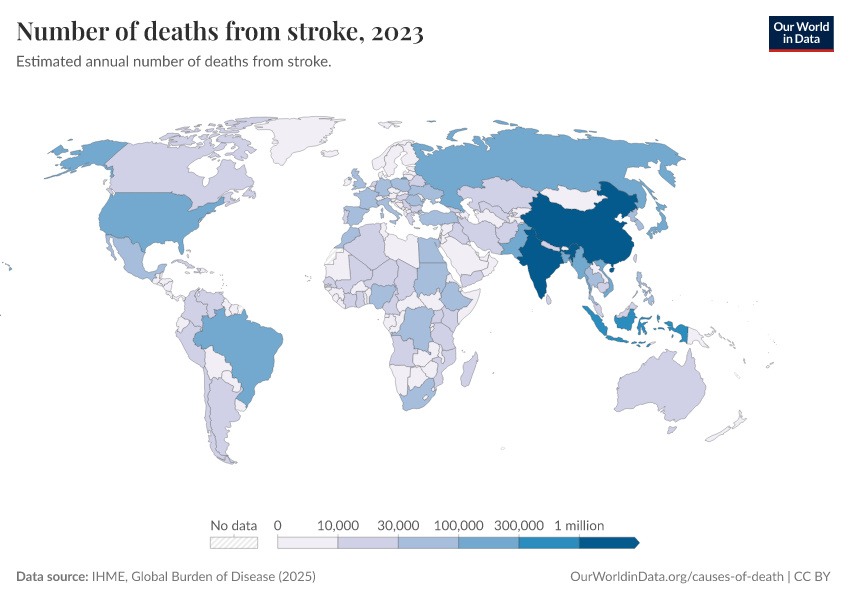 IHME, Global Burden of Disease (2025) – with major processing by Our World in Data. “Number of deaths from stroke” [dataset]. IHME, Global Burden of Disease, “Global Burden of Disease - Deaths” [original data]. Retrieved February 25, 2026 from https://data-unoosa-launches.owid.pages.dev:8789/20260211-174736/grapher/deaths-from-strokes.html (archived on February 11, 2026).