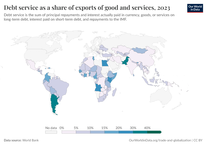 “Data Page: Debt service as a share of exports of good and services”. Our World in Data (2026). Data adapted from World Bank. Retrieved from https://data-unoosa-launches.owid.pages.dev:8789/20260130-180113/grapher/debt-service-of-exports-of-goods-services.html [online resource] (archived on January 30, 2026).How to cite this data