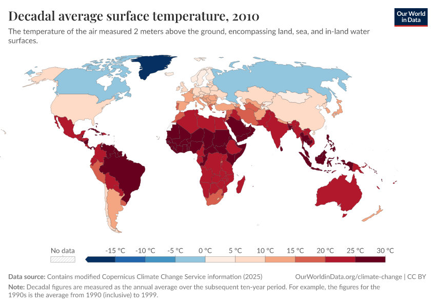 “Data Page: Decadal average surface temperature”, part of the following publication: Hannah Ritchie, Pablo Rosado, and Veronika Samborska (2024) - “Climate Change”. Data adapted from Contains modified Copernicus Climate Change Service information. Retrieved from https://data-unoosa-launches.owid.pages.dev:8789/20260210-110915/grapher/decadal-average-surface-temperature.html [online resource] (archived on February 10, 2026).How to cite this data