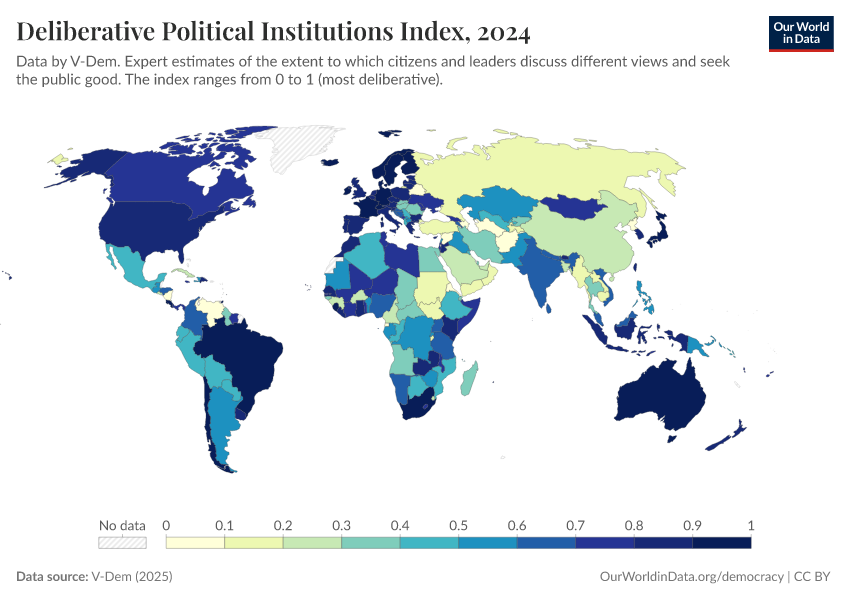 “Data Page: Deliberative political institutions index”, part of the following publication: Bastian Herre, Lucas Rodés-Guirao, and Esteban Ortiz-Ospina (2013) - “Democracy”. Data adapted from V-Dem. Retrieved from https://data-unoosa-launches.owid.pages.dev:8789/20260119-070102/grapher/deliberative-political-institutions-index.html [online resource] (archived on January 19, 2026).How to cite this data