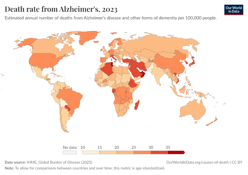 IHME, Global Burden of Disease (2025) – with major processing by Our World in Data. “Death rate from Alzheimer's” [dataset]. IHME, Global Burden of Disease, “Global Burden of Disease - Deaths” [original data]. Retrieved February 25, 2026 from https://data-unoosa-launches.owid.pages.dev:8789/20260211-173942/grapher/dementia-death-rates.html (archived on February 11, 2026).