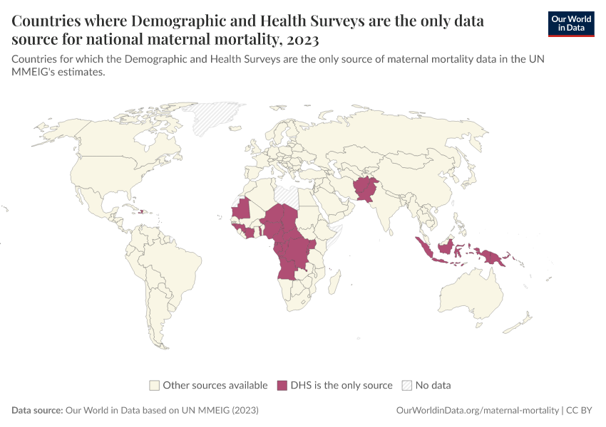 Our World in Data based on UN MMEIG (2023) – processed by Our World in Data. “Countries where Demographic and Health Surveys are the only data source for national maternal mortality” [dataset]. Our World in Data based on UN MMEIG, “Countries for which DHS is the only source for UN MMEIG maternal mortality estimates” [original data]. Retrieved February 25, 2026 from https://data-unoosa-launches.owid.pages.dev:8789/20260224-141219/grapher/dhs-is-the-only-source-of-maternal-mortality-data.html (archived on February 24, 2026).