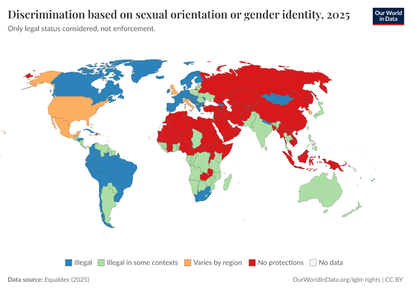 Equaldex (2025) – with major processing by Our World in Data. “Discrimination based on sexual orientation or gender identity” [dataset]. Equaldex, “Equaldex” [original data]. Retrieved February 25, 2026 from https://data-unoosa-launches.owid.pages.dev:8789/20250909-093708/grapher/discrimination-lgbt-equaldex.html (archived on September 9, 2025).