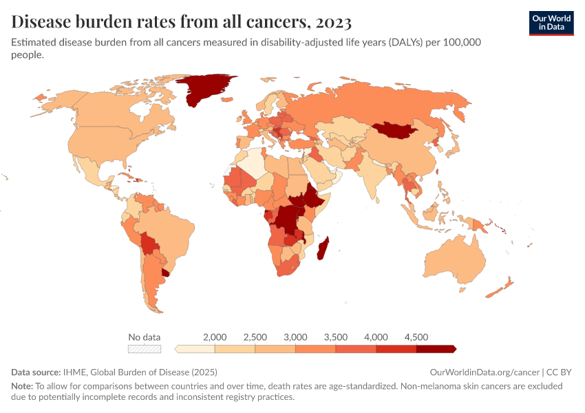 IHME, Global Burden of Disease (2025) – with major processing by Our World in Data. “Disease burden rates from all cancers” [dataset]. IHME, Global Burden of Disease, “Global Burden of Disease - DALYs” [original data]. Retrieved February 25, 2026 from https://data-unoosa-launches.owid.pages.dev:8789/20260211-174736/grapher/disease-burden-rates-from-cancers.html (archived on February 11, 2026).