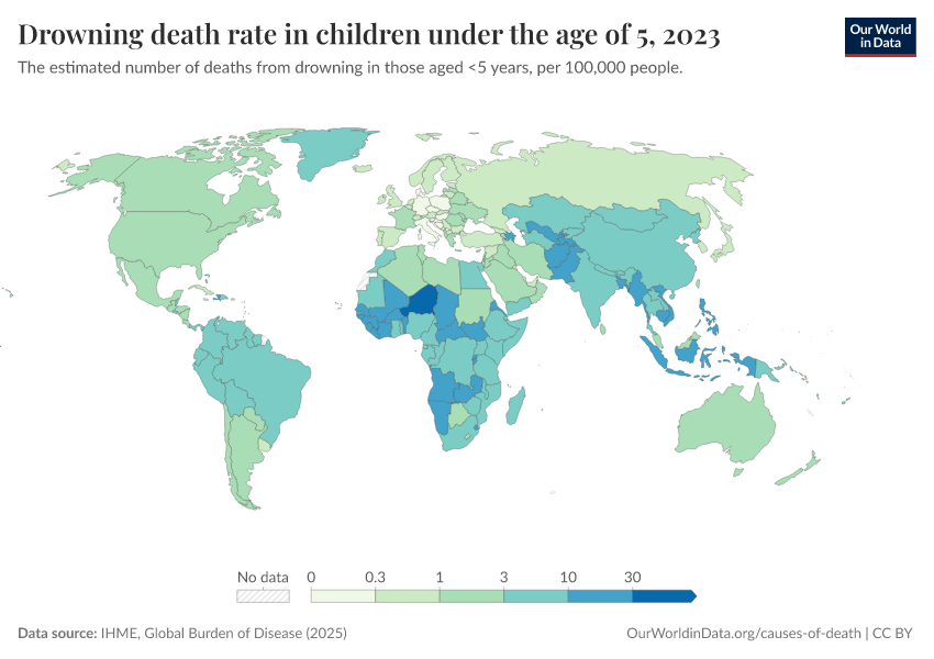 IHME, Global Burden of Disease (2025) – with major processing by Our World in Data. “Drowning death rate in children under the age of 5” [dataset]. IHME, Global Burden of Disease, “Global Burden of Disease - Deaths” [original data]. Retrieved February 25, 2026 from https://data-unoosa-launches.owid.pages.dev:8789/20260211-174736/grapher/drowning-death-rates-under-5.html (archived on February 11, 2026).