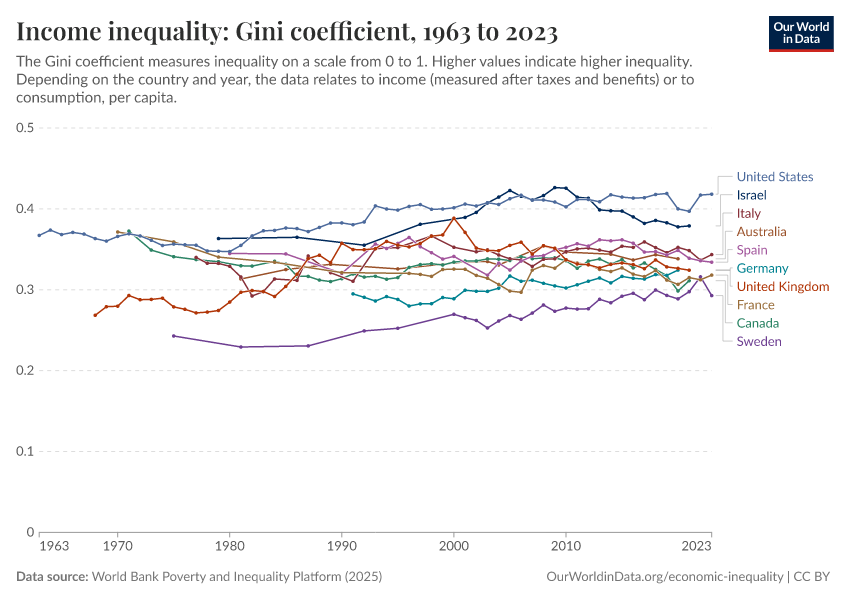 “Data Page: Income inequality: Gini coefficient”, part of the following publication: Joe Hasell, Bertha Rohenkohl, Pablo Arriagada, Esteban Ortiz-Ospina, and Max Roser (2023) - “Economic Inequality”. Data adapted from World Bank Poverty and Inequality Platform. Retrieved from https://data-unoosa-launches.owid.pages.dev:8789/20260127-114142/grapher/economic-inequality-gini-index.html [online resource] (archived on January 27, 2026).
