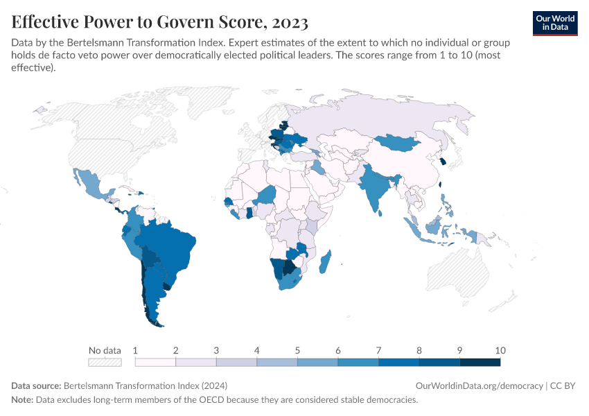 “Data Page: Effective Power to Govern Score”, part of the following publication: Bastian Herre, Lucas Rodés-Guirao, and Esteban Ortiz-Ospina (2013) - “Democracy”. Data adapted from Bertelsmann Transformation Index. Retrieved from https://data-unoosa-launches.owid.pages.dev:8789/20260204-170225/grapher/effective-power-to-govern-score-bti.html [online resource] (archived on February 4, 2026).How to cite this data