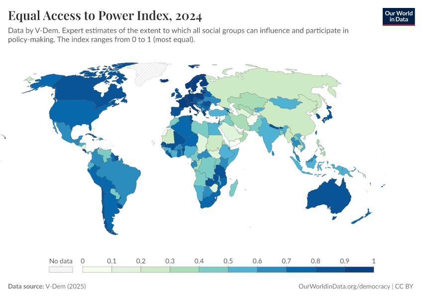 “Data Page: Equal access to power index”, part of the following publication: Bastian Herre, Lucas Rodés-Guirao, and Esteban Ortiz-Ospina (2013) - “Democracy”. Data adapted from V-Dem. Retrieved from https://data-unoosa-launches.owid.pages.dev:8789/20260119-070102/grapher/equal-access-to-power-index.html [online resource] (archived on January 19, 2026).How to cite this data