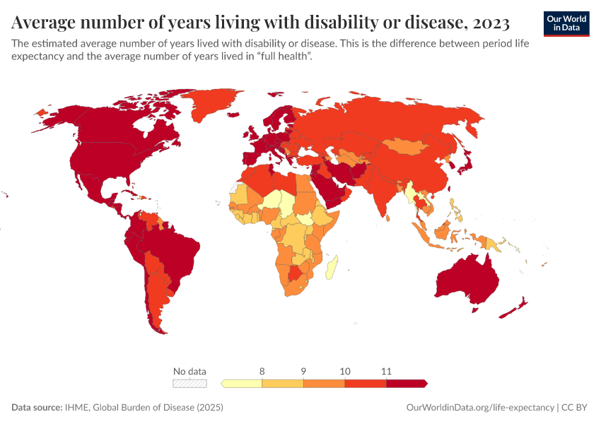 “Data Page: Average number of years living with disability or disease”, part of the following publication: Saloni Dattani, Lucas Rodés-Guirao, Hannah Ritchie, Esteban Ortiz-Ospina, and Max Roser (2023) - “Life Expectancy”. Data adapted from IHME, Global Burden of Disease. Retrieved from https://data-unoosa-launches.owid.pages.dev:8789/20260213-171235/grapher/expected-years-of-living-with-disability-or-disease-burden.html [online resource] (archived on February 13, 2026).How to cite this data