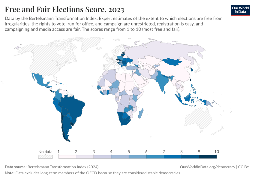 Bertelsmann Transformation Index (2024) – processed by Our World in Data. “Free and Fair Elections Score” [dataset]. Bertelsmann Transformation Index, “Bertelsmann Transformation Index, Scores” [original data]. Retrieved February 25, 2026 from https://data-unoosa-launches.owid.pages.dev:8789/20260204-170225/grapher/free-fair-elections-bti.html (archived on February 4, 2026).