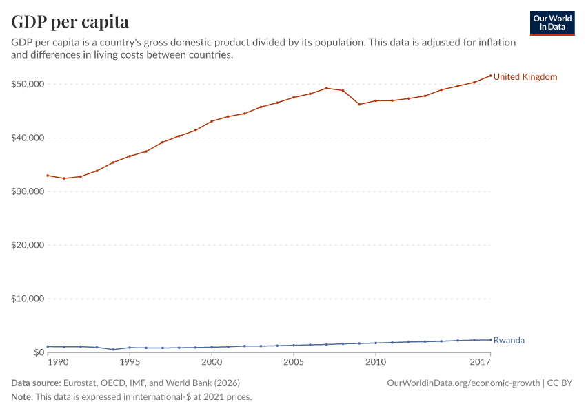• This data comes from the World Bank and starts in 1990. For estimates going back several centuries, explore our chart of GDP per capita from the Maddison Project Database.