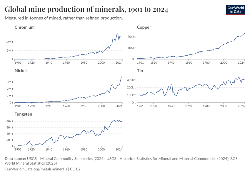 USGS - Mineral Commodity Summaries (2025); USGS - Historical Statistics for Mineral and Material Commodities (2024); BGS - World Mineral Statistics (2025) – with major processing by Our World in Data. “Global mine production of minerals” [dataset]. United States Geological Survey, “Mineral Commodity Summaries”; United States Geological Survey, “Historical Statistics for Mineral and Material Commodities”; British Geological Survey, “World Mineral Statistics” [original data]. Retrieved February 25, 2026 from https://data-unoosa-launches.owid.pages.dev:8789/20260116-170644/grapher/global-mine-production-minerals.html (archived on January 16, 2026).