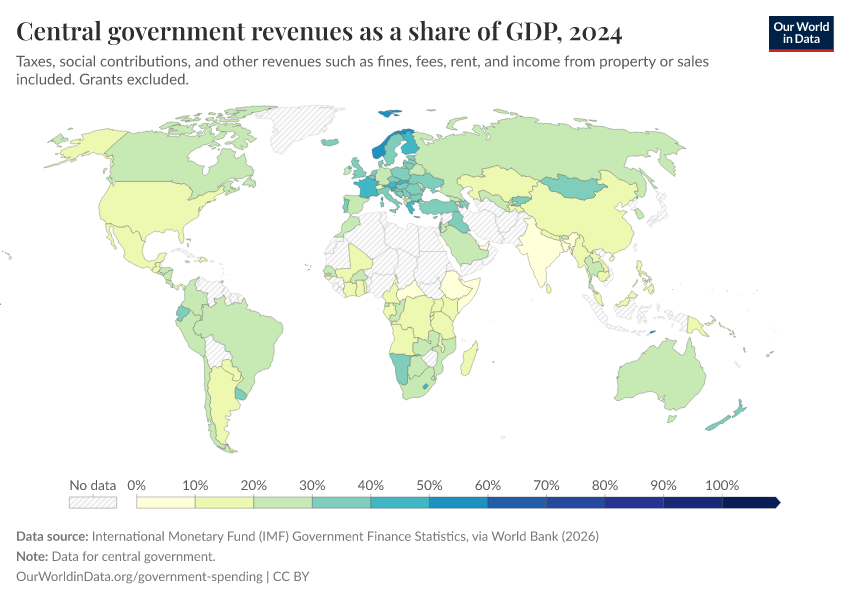 “Data Page: Central government revenues as a share of GDP”. Our World in Data (2026). Data adapted from International Monetary Fund (IMF) Government Finance Statistics, via World Bank. Retrieved from https://data-unoosa-launches.owid.pages.dev:8789/20260202-181317/grapher/government-revenues-as-a-share-of-gdp-world-bank.html [online resource] (archived on February 2, 2026).How to cite this data