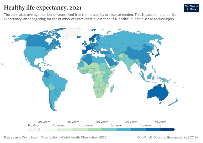 “Data Page: Healthy life expectancy”. Our World in Data (2026). Data adapted from World Health Organization. Retrieved from https://data-unoosa-launches.owid.pages.dev:8789/20260119-070102/grapher/healthy-life-expectancy-at-birth.html [online resource] (archived on January 19, 2026).How to cite this data