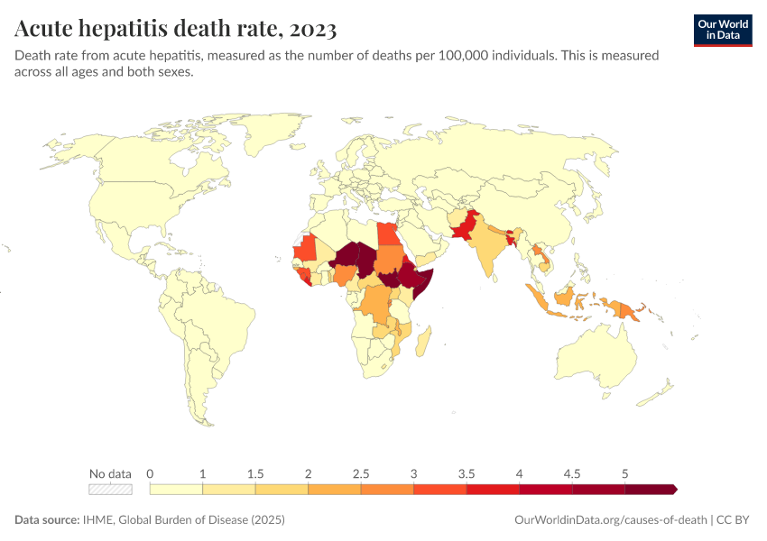 “Data Page: Acute hepatitis death rate”, part of the following publication: Esteban Ortiz-Ospina and Max Roser (2016) - “Global Health”. Data adapted from IHME, Global Burden of Disease. Retrieved from https://data-unoosa-launches.owid.pages.dev:8789/20260211-174736/grapher/hepatitis-death-rate.html [online resource] (archived on February 11, 2026).How to cite this data