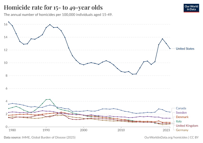 IHME, Global Burden of Disease (2025) – with major processing by Our World in Data. “Homicide rate for 15- to 49-year olds” [dataset]. IHME, Global Burden of Disease, “Global Burden of Disease - Deaths” [original data]. Retrieved February 25, 2026 from https://data-unoosa-launches.owid.pages.dev:8789/20260211-174736/grapher/homicide-rate-in-15--to-49-year-olds.html (archived on February 11, 2026).
