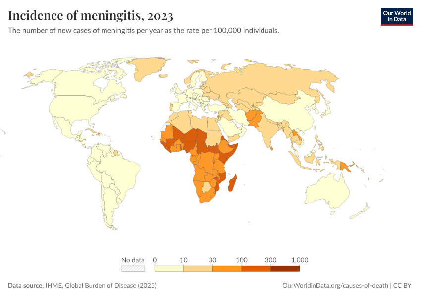 “Data Page: Incidence of meningitis”, part of the following publication: Esteban Ortiz-Ospina and Max Roser (2016) - “Global Health”. Data adapted from IHME, Global Burden of Disease. Retrieved from https://data-unoosa-launches.owid.pages.dev:8789/20260212-172859/grapher/incidence-of-meningitis.html [online resource] (archived on February 12, 2026).How to cite this data