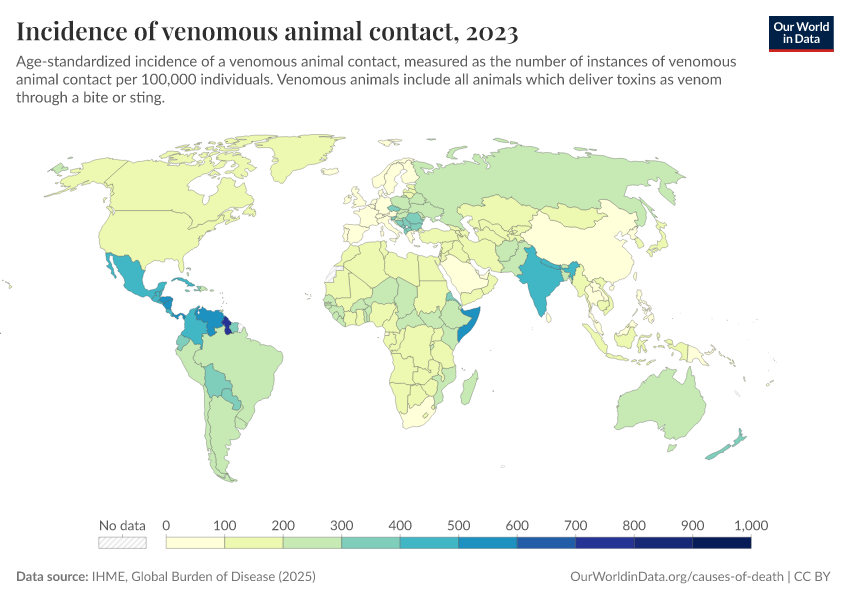 “Data Page: Incidence of venomous animal contact”, part of the following publication: Esteban Ortiz-Ospina and Max Roser (2016) - “Global Health”. Data adapted from IHME, Global Burden of Disease. Retrieved from https://data-unoosa-launches.owid.pages.dev:8789/20260212-172132/grapher/incidence-of-venomous-animal-contact.html [online resource] (archived on February 12, 2026).How to cite this data