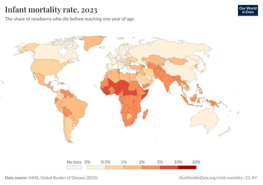 IHME, Global Burden of Disease (2025) – with minor processing by Our World in Data. “Infant mortality rate” [dataset]. IHME, Global Burden of Disease, “Global Burden of Disease - Child Mortality” [original data]. Retrieved February 25, 2026 from https://data-unoosa-launches.owid.pages.dev:8789/20260213-140117/grapher/infant-mortality-rate.html (archived on February 13, 2026).