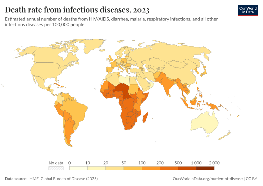 IHME, Global Burden of Disease (2025) – with major processing by Our World in Data. “Death rate from infectious diseases” [dataset]. IHME, Global Burden of Disease, “Global Burden of Disease - Deaths” [original data]. Retrieved February 25, 2026 from https://data-unoosa-launches.owid.pages.dev:8789/20260211-174736/grapher/infectious-disease-death-rates-gbd.html (archived on February 11, 2026).