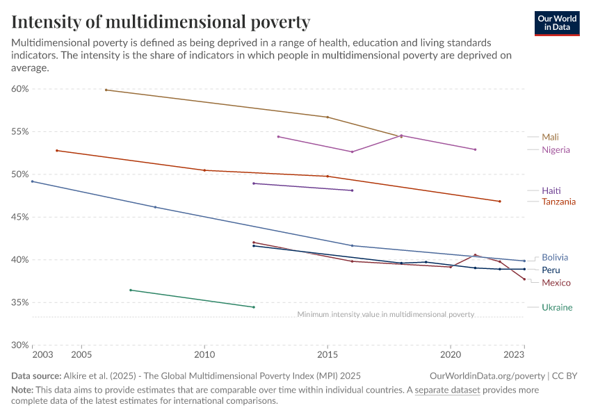 Alkire et al. (2025) - The Global Multidimensional Poverty Index (MPI) 2025 – with minor processing by Our World in Data. “Intensity of multidimensional poverty – Harmonized over time” [dataset]. Alkire et al., “Global Multidimensional Poverty Index (MPI) 2025” [original data]. Retrieved February 25, 2026 from https://data-unoosa-launches.owid.pages.dev:8789/20251229-175603/grapher/intensity-of-multidimensional-poverty-hot.html (archived on December 29, 2025).