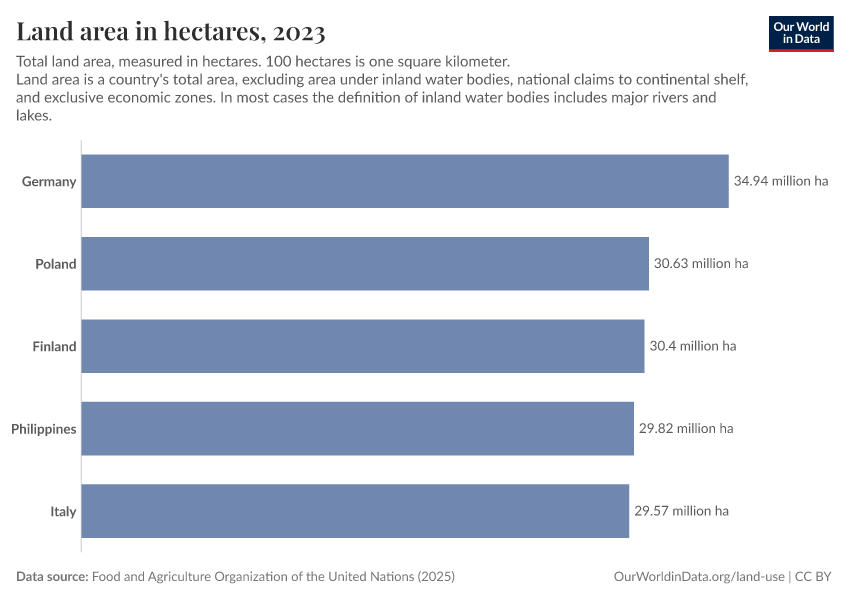 “Data Page: Land area in hectares”, part of the following publication: Hannah Ritchie, Pablo Rosado, and Max Roser (2023) - “Agricultural Production”. Data adapted from Food and Agriculture Organization of the United Nations. Retrieved from https://data-unoosa-launches.owid.pages.dev:8789/20260119-235736/grapher/land-area-hectares.html [online resource] (archived on January 19, 2026).How to cite this data