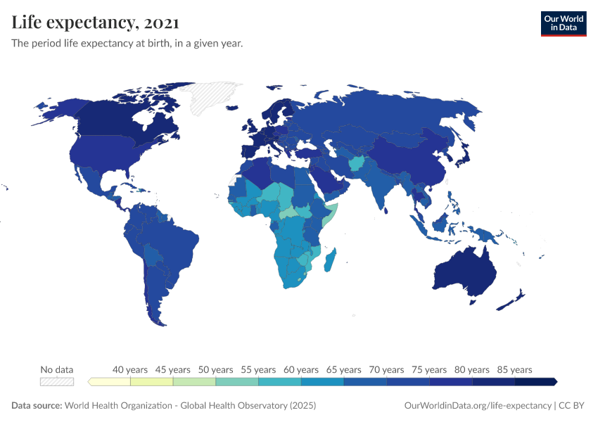 “Data Page: Life expectancy”. Our World in Data (2026). Data adapted from World Health Organization. Retrieved from https://data-unoosa-launches.owid.pages.dev:8789/20260119-070102/grapher/life-expectancy-at-birth-who-gho.html [online resource] (archived on January 19, 2026).How to cite this data