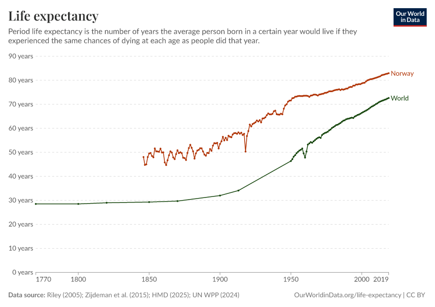 This chart combines data from several sources. For country-level data before 1950, we use the Human Mortality Database (2025) data and Zijdeman et al. (2015). For country-years where these sources overlap, we use the Human Mortality Database.