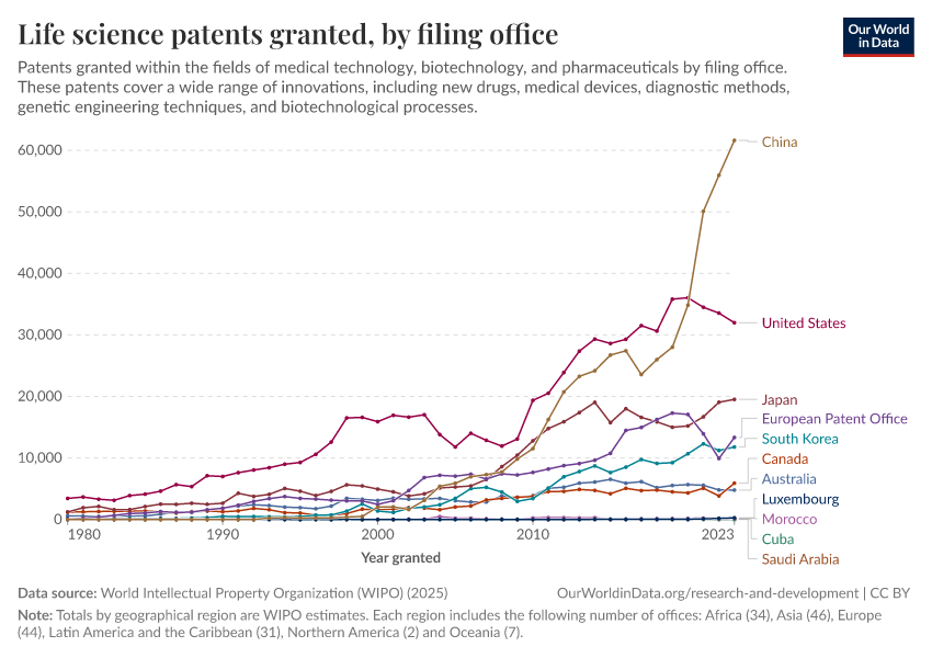 “Data Page: Life science patents granted, by filing office”, part of the following publication: Tuna Acisu, Saloni Dattani, Fiona Spooner, Veronika Samborska, Hannah Ritchie, and Max Roser (2025) - “Medicine and Biotechnology”. Data adapted from World Intellectual Property Organization (WIPO). Retrieved from https://data-unoosa-launches.owid.pages.dev:8789/20251031-120222/grapher/medicine-and-biotechnology-patents-granted-by-filing-office.html [online resource] (archived on October 31, 2025).How to cite this data