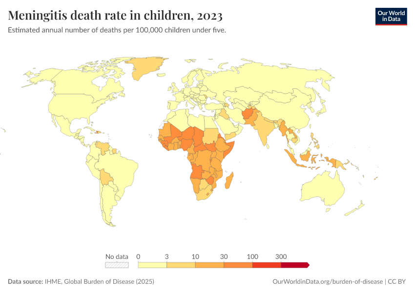 IHME, Global Burden of Disease (2025) – with major processing by Our World in Data. “Meningitis death rate in children” [dataset]. IHME, Global Burden of Disease, “Global Burden of Disease - Deaths” [original data]. Retrieved February 25, 2026 from https://data-unoosa-launches.owid.pages.dev:8789/20260211-174736/grapher/meningitis-death-rates-children-under-5.html (archived on February 11, 2026).