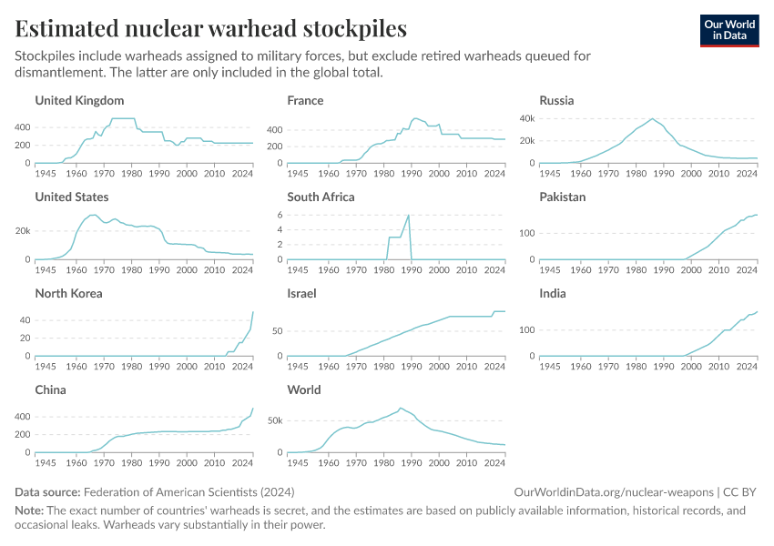 “Data Page: Estimated nuclear warhead stockpiles”, part of the following publication: Bastian Herre, Pablo Rosado, and Max Roser (2024) - “Nuclear Weapons”. Data adapted from Federation of American Scientists. Retrieved from https://data-unoosa-launches.owid.pages.dev:8789/20250909-093708/grapher/nuclear-warhead-stockpiles-lines.html [online resource] (archived on September 9, 2025).How to cite this data