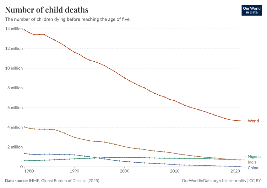 “Data Page: Number of child deaths”, part of the following publication: Esteban Ortiz-Ospina and Max Roser (2016) - “Global Health”. Data adapted from IHME, Global Burden of Disease. Retrieved from https://data-unoosa-launches.owid.pages.dev:8789/20260211-174736/grapher/number-of-child-deaths.html [online resource] (archived on February 11, 2026).How to cite this data