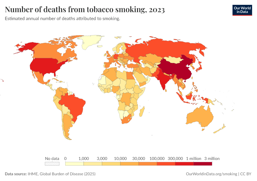 “Data Page: Number of deaths from tobacco smoking”, part of the following publication: Esteban Ortiz-Ospina and Max Roser (2016) - “Global Health”. Data adapted from IHME, Global Burden of Disease. Retrieved from https://data-unoosa-launches.owid.pages.dev:8789/20260213-112438/grapher/number-of-deaths-from-tobacco-smoking.html [online resource] (archived on February 13, 2026).How to cite this data