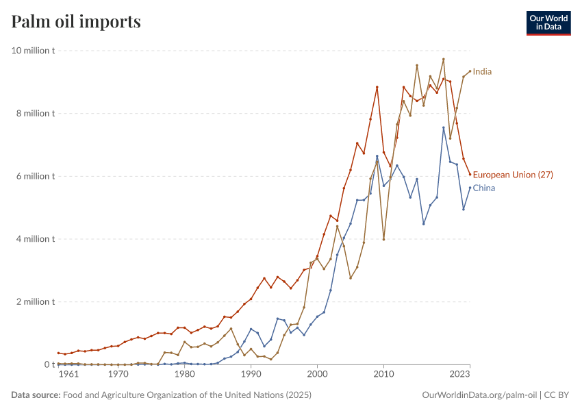 “Data Page: Imports of palm oil”. Our World in Data (2026). Data adapted from Food and Agriculture Organization of the United Nations. Retrieved from https://data-unoosa-launches.owid.pages.dev:8789/20260116-144923/grapher/palm-oil-imports.html [online resource] (archived on January 16, 2026).How to cite this data