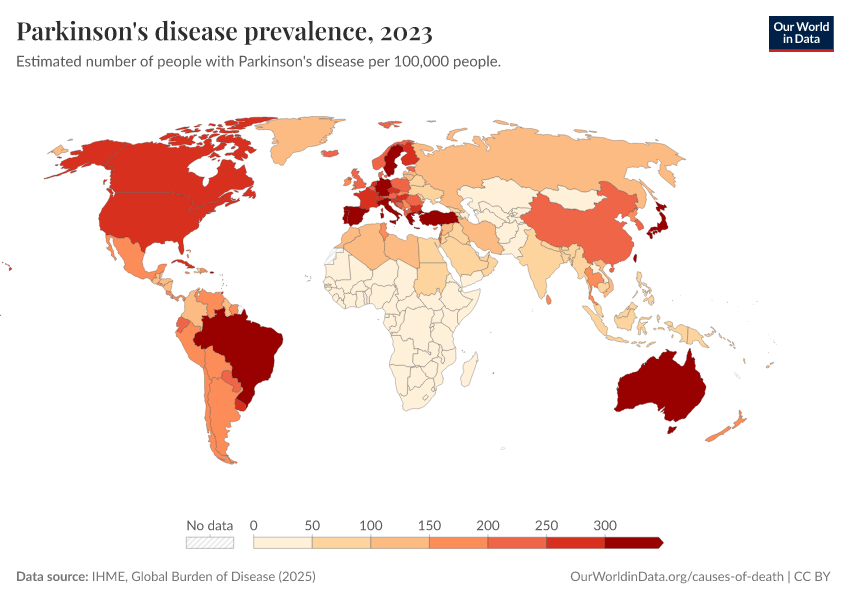 “Data Page: Parkinson's disease prevalence”, part of the following publication: Esteban Ortiz-Ospina and Max Roser (2016) - “Global Health”. Data adapted from IHME, Global Burden of Disease. Retrieved from https://data-unoosa-launches.owid.pages.dev:8789/20260212-172859/grapher/parkinsons-disease-prevalence-ihme.html [online resource] (archived on February 12, 2026).How to cite this data