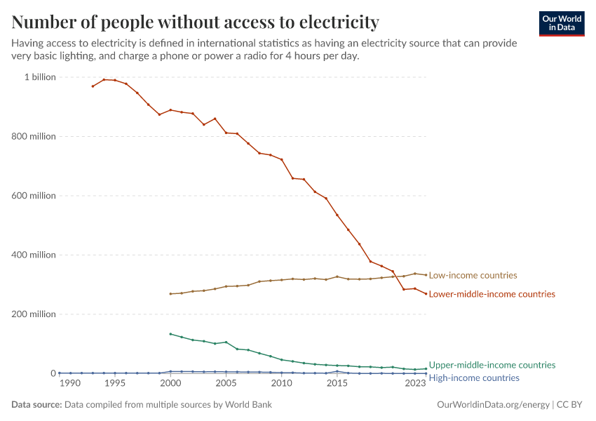 Data compiled from multiple sources by World Bank – with major processing by Our World in Data. “Number of people without access to electricity – World Bank” [dataset]. SDG 7.1.1 Electrification Dataset, World Bank, via World Bank, “World Development Indicators 125”; United Nations Population Division, national statistical offices, and Eurostat, via World Bank, “World Development Indicators 125” [original data]. Retrieved February 25, 2026 from https://data-unoosa-launches.owid.pages.dev:8789/20260202-181317/grapher/people-without-electricity-country.html (archived on February 2, 2026).