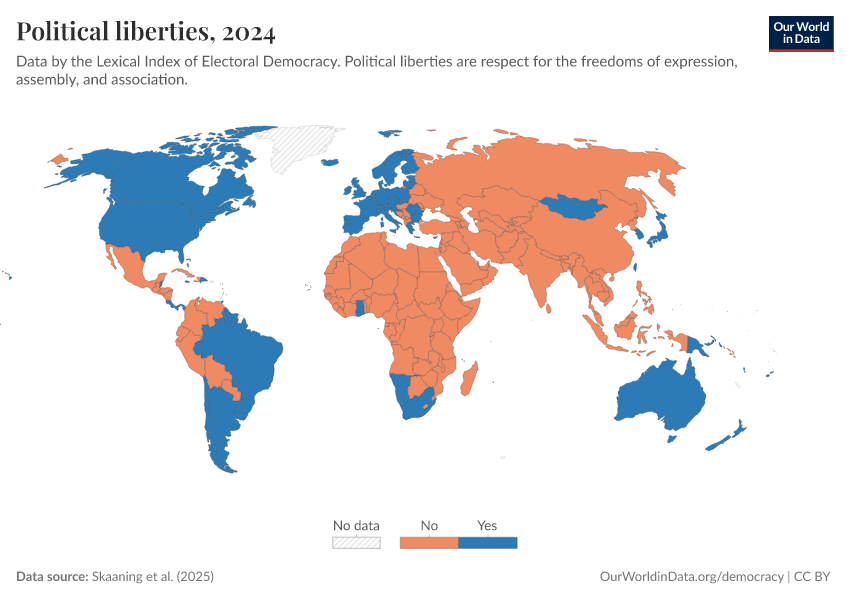 Skaaning et al. (2025) – processed by Our World in Data. “Political liberties” [dataset]. Skaaning et al., “Lexical Index of Electoral Democracy (LIED) v6.8” [original data]. Retrieved February 25, 2026 from https://data-unoosa-launches.owid.pages.dev:8789/20260119-065148/grapher/political-liberties-lexical.html (archived on January 19, 2026).