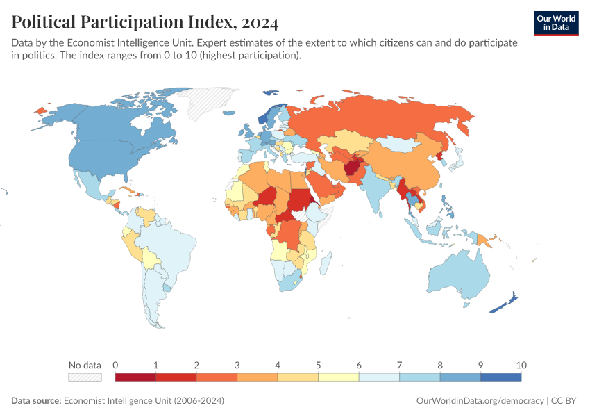 Economist Intelligence Unit (2006-2024) – processed by Our World in Data. “Political Participation Index” [dataset]. Economist Intelligence Unit, “Democracy Index 2021: The China challenge”; Economist Intelligence Unit, “Democracy Index 2022: Frontline democracy and the battle for Ukraine”; Economist Intelligence Unit, “Democracy Index 2023: Age of Conflict”; Economist Intelligence Unit, “Democracy Index 2024: What's wrong with representative democracy?”; Gapminder, “Democracy Index v4”; Various sources, “Population” [original data]. Retrieved February 25, 2026 from https://data-unoosa-launches.owid.pages.dev:8789/20260119-070102/grapher/political-participation-index-eiu.html (archived on January 19, 2026).