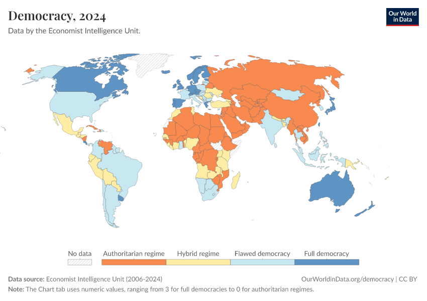 Economist Intelligence Unit (2006-2024) – processed by Our World in Data. “Democracy” [dataset]. Economist Intelligence Unit, “Democracy Index 2021: The China challenge”; Economist Intelligence Unit, “Democracy Index 2022: Frontline democracy and the battle for Ukraine”; Economist Intelligence Unit, “Democracy Index 2023: Age of Conflict”; Economist Intelligence Unit, “Democracy Index 2024: What's wrong with representative democracy?”; Gapminder, “Democracy Index v4” [original data]. Retrieved February 25, 2026 from https://data-unoosa-launches.owid.pages.dev:8789/20260105-133053/grapher/political-regime-eiu.html (archived on January 5, 2026).