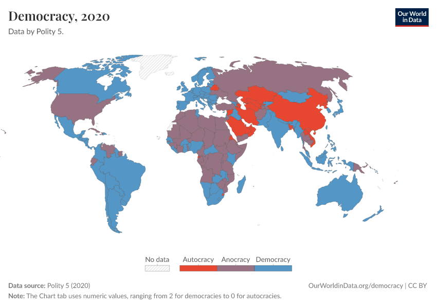- We have other democracy data sources that also cover more recent years and have more precise data. You can find them in our Key Democracy Charts and Democracy Data Explorer.