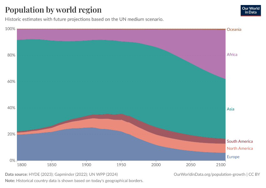 “Data Page: Population by world region”, part of the following publication: Hannah Ritchie, Lucas Rodés-Guirao, Edouard Mathieu, Marcel Gerber, Esteban Ortiz-Ospina, Joe Hasell, and Max Roser (2023) - “Population Growth”. Data adapted from PBL Netherlands Environmental Assessment Agency, Gapminder, United Nations. Retrieved from https://data-unoosa-launches.owid.pages.dev:8789/20260119-065148/grapher/population-regions-with-projections.html [online resource] (archived on January 19, 2026).How to cite this data
