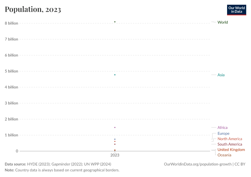 - We calculate geographical aggregates (continents, income groups, etc.) by summing individual country populations. For years before 1800, we rely directly on HYDE's values for continents to ensure historical consistency.