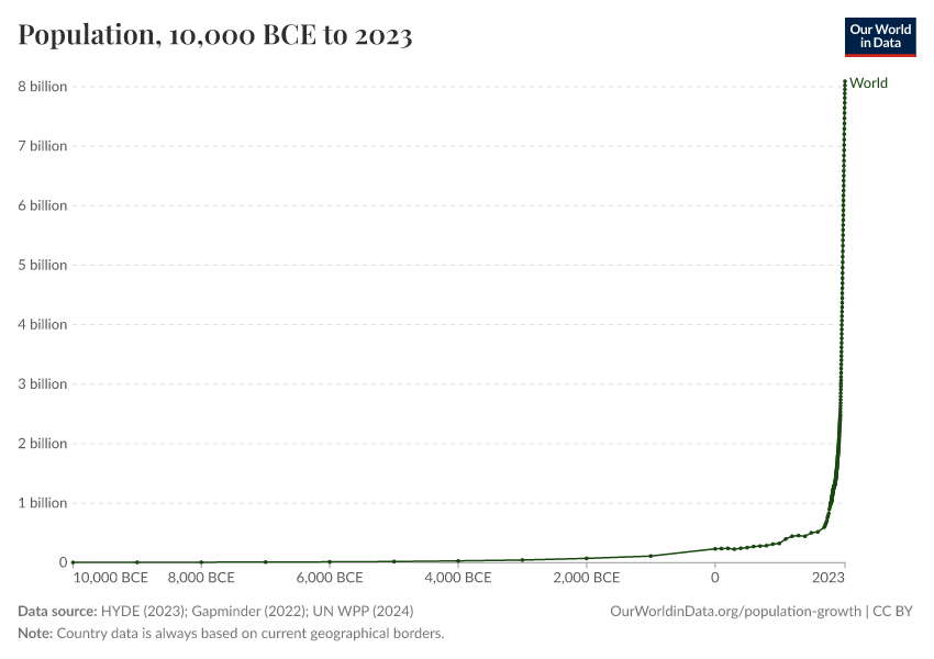 “Data Page: Population”, part of the following publication: Hannah Ritchie, Lucas Rodés-Guirao, Edouard Mathieu, Marcel Gerber, Esteban Ortiz-Ospina, Joe Hasell, and Max Roser (2023) - “Population Growth”. Data adapted from PBL Netherlands Environmental Assessment Agency, Gapminder, United Nations. Retrieved from https://data-unoosa-launches.owid.pages.dev:8789/20260119-065148/grapher/population.html [online resource] (archived on January 19, 2026).How to cite this data