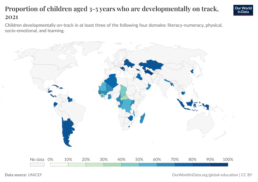 “Data Page: Proportion of children aged 3-5 years who are developmentally on track”. Our World in Data (2026). Data adapted from UNICEF. Retrieved from https://data-unoosa-launches.owid.pages.dev:8789/20260105-133053/grapher/proportion-of-children-developmentally-on-track.html [online resource] (archived on January 5, 2026).How to cite this data