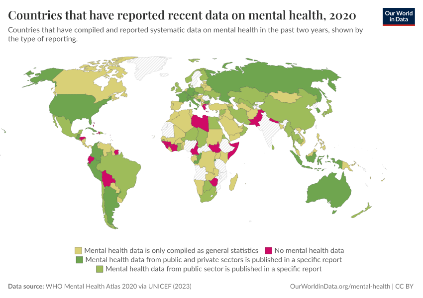 “Data Page: Countries that have reported recent data on mental health”, part of the following publication: Saloni Dattani, Lucas Rodés-Guirao, Hannah Ritchie, and Max Roser (2023) - “Mental Health”. Data adapted from WHO Mental Health Atlas 2020 via UNICEF. Retrieved from https://data-unoosa-launches.owid.pages.dev:8789/20260224-141219/grapher/reporting-of-mental-health-system-data-in-the-past-two-years.html [online resource] (archived on February 24, 2026).How to cite this data