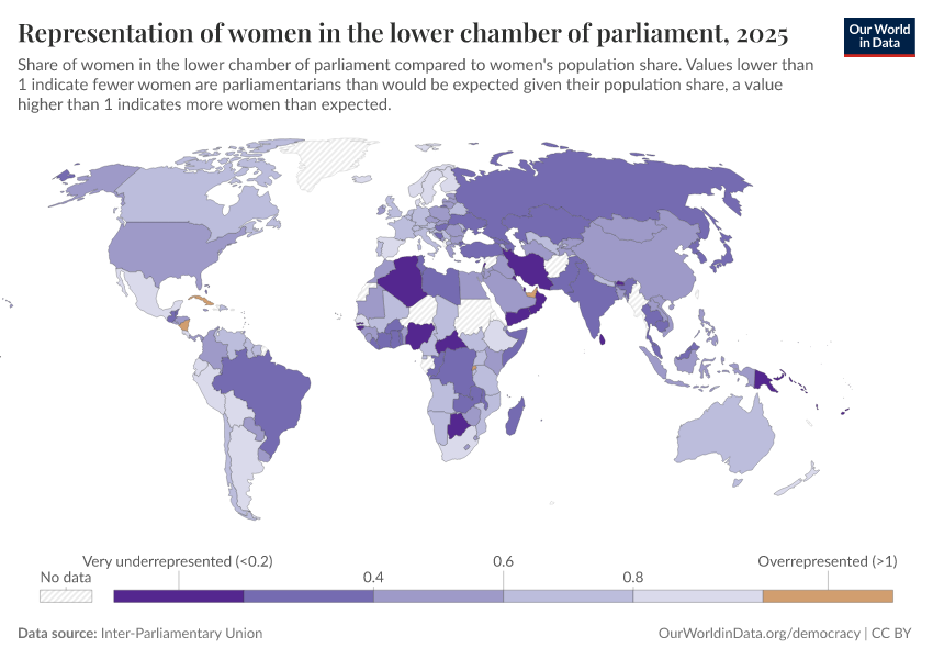 “Data Page: Representation of women in the lower chamber of parliament”. Our World in Data (2026). Data adapted from Inter-Parliamentary Union. Retrieved from https://data-unoosa-launches.owid.pages.dev:8789/20260130-180113/grapher/representation-of-women-in-lower-chamber-of-parliament.html [online resource] (archived on January 30, 2026).How to cite this data