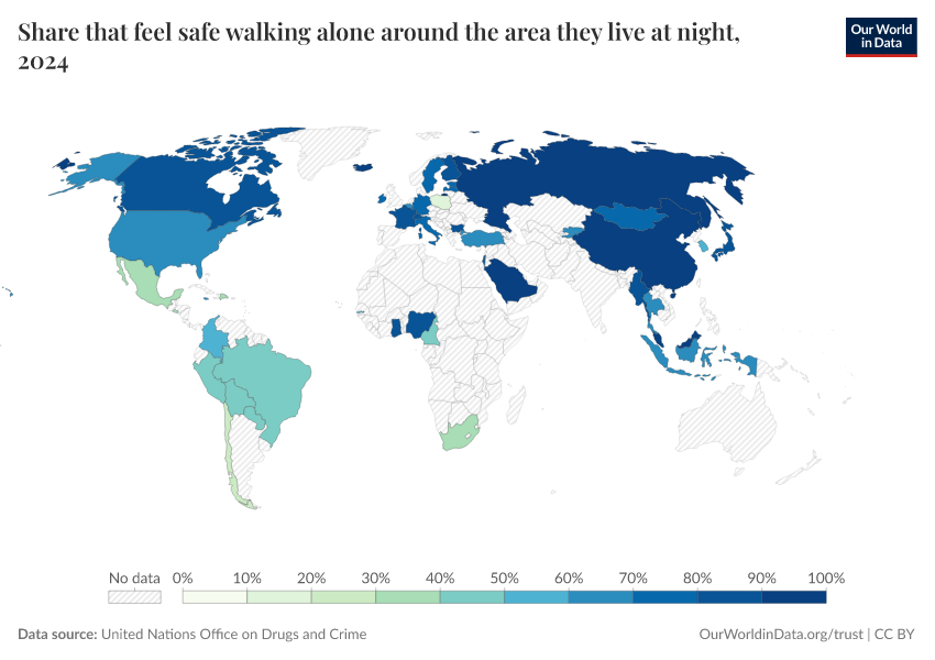 “Data Page: Share that feel safe walking alone around the area they live at night”. Our World in Data (2026). Data adapted from United Nations Office on Drugs and Crime. Retrieved from https://data-unoosa-launches.owid.pages.dev:8789/20251120-211749/grapher/safety-walking-alone.html [online resource] (archived on November 20, 2025).How to cite this data