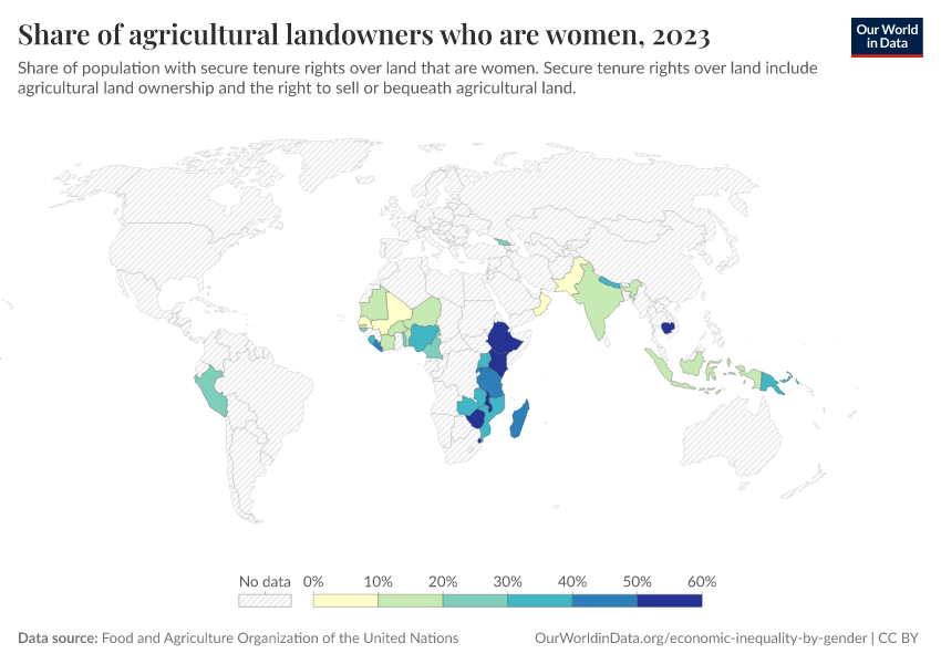 “Data Page: Share of agricultural landowners who are women”. Our World in Data (2026). Data adapted from Food and Agriculture Organization of the United Nations. Retrieved from https://data-unoosa-launches.owid.pages.dev:8789/20260105-133053/grapher/share-of-agricultural-land-owners-that-are-women.html [online resource] (archived on January 5, 2026).How to cite this data