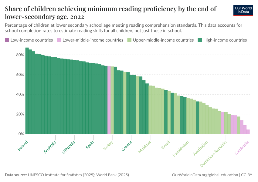 “Data Page: Share of children achieving minimum reading proficiency by the end of lower secondary age”, part of the following publication: Hannah Ritchie, Veronika Samborska, Esteban Ortiz-Ospina, and Max Roser (2023) - “Global Education”. Data adapted from UNESCO Institute for Statistics. Retrieved from https://data-unoosa-launches.owid.pages.dev:8789/20260122-091445/grapher/share-of-children-reaching-sufficient-reading-comprehension-by-the-end-of-lower-secondary-age.html [online resource] (archived on January 22, 2026).How to cite this data